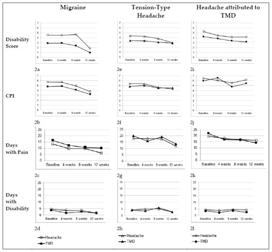 Visual representation of the outcome measures for patients with TMD stratified per headache type (migraine, TTH and headache attributed to TMD): Disability Score (a,e,i), Characteristic Pain Intensity (b,f,j), Days with Pain (c,g,k), and Days with Disability (d,h,l). CPI: Characteristic Pain Intensity; TMD: Temporomandibular Disorder.