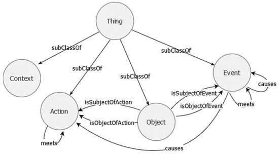To provide the ontology with the capability of representing spatio-temporal information by relating the different classes, two additions were performed. First, Allen’s temporal relations [21] were adopted (e.g., “meets” as a relation used to define the timeline of the scenario by relating Action and Events in temporal order).