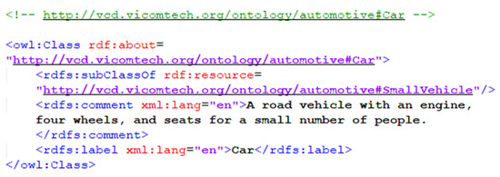 In relation to the reusable resources related to the automotive domain, in 2018 a survey of existing ontologies for transportation was carried out [15] in which several approaches were studied and compared. Among these, the ontology for road traffic management [16] presents bidirectional axioms (“doesAction” and “isActionDoneBy”) that relate classes to driving actions. Other examples also consider attributes by introducing additional axioms into the ontology.