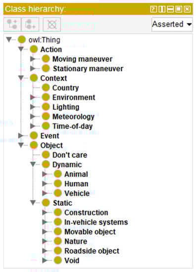 In general, these datasets do not define classes in a hierarchy but often constitute a one-level list. In addition, only two of the listed datasets cover a few classes related to maneuvers (Action classes in the AGO domain). However, actions are presented as special attributes of the corresponding objects. Due to the manner in which they are defined, these datasets do not consider the need of making a distinction between Action and Events. Moreover, they do not present semantically relevant relations among these elements and the objects. Taking into account that most of these datasets do not consider the traffic maneuvers, the “ALKS Regulation UN R157” (https://undocs.org/ECE/TRANS/WP.29/2020/81 accessed on 20 July 2021) was included in AGO so that the ontology gathers the critical scenarios listed in the regulation as Actions, along with some additional Object classes and properties. As a result, AGO is an ontology that offers flexibility for present and future labeling needs, supported by the established mechanism to connect Objects, Actions, and Events through Relations. AGO also includes, in its current form, a rich set of object classes, which are easily extensible, and an equivalently wide number of actions and maneuvers that can serve as a basis for multiple applications in the domain (e.g., test coverage analysis, online data recording, and digital twins).