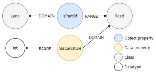 The taxonomy tree for the main classes in Protégé and OpenLABEL differs because the relations are not defined as a Class type in the graph representation. The user-defined axioms are defined as object property nodes and connected with the required elements with the “DOMAIN” and “RANGE” relationships to build the RDF triples. Hence, the subject of the triple is represented by the domain and the object by the range terms. Figure 5 represents the “Lane”–“isPartOf” -> “Road” object property triple as a graph. In addition, Figure 5 also depicts how the “curvature” attribute is related to the “Road” class following the data property syntax definition.
