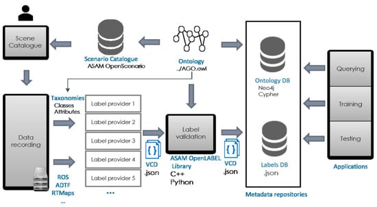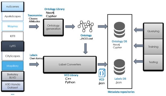 As a result, business models for labeling have emerged, in which label producers offer services to create large datasets from raw data recordings. As an example, from 2018 to 2020, almost 20 very large open datasets were released for the development of Autonomous Driving (AD) technologies (see nuScenes (https://www.nuscenes.org/ accessed on 14 March 2021), Lyft Level 5 (https://level5.lyft.com/dataset/ accessed on 14 March 2021), H3D Honda Dataset (https://usa.honda-ri.com/H3D accessed on 14 March 2021), Waymo (https://waymo.com/open/ accessed on 14 March 2021), Audi A2-D2 (https://www.a2d2.audi/a2d2/en.html accessed on 14 March 2021), Berkeley Deep-Dive (BDD) (https://bdd-data.berkeley.edu/ accessed on 14 March 2021), Apolloscape (http://apolloscape.auto/ accessed on 14 March 2021), or Mapillary Vistas (https://www.mapillary.com/dataset/vistas accessed on 14 March 2021)). These approaches solve the short-term need for labels in DL training stages, but create new challenges for long-term operation: evolution of label types, class taxonomies, and hierarchies; fusion or comparison of labels from heterogeneous sources; scene management and searching via complex queries, etc. Other problems include the use of human languages and synonyms, different taxonomies (hierarchies of classes), and different types of attributes and properties. In turn, this leads to the problem of having to develop a new model for each dataset. Hence, dataset labeling approaches require representation of the data linked to ontology-based semantics [1].