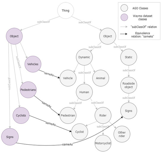 As an example of the above-mentioned process, Figure 8 depicts a graphical representation of the classes defined in the “Waymo” dataset mapped to their equivalent AGO classes. The equivalence among elements is defined by the “owl:sameAs” relationship, which means that one can be replaced by the other without altering the meaning and vice versa.