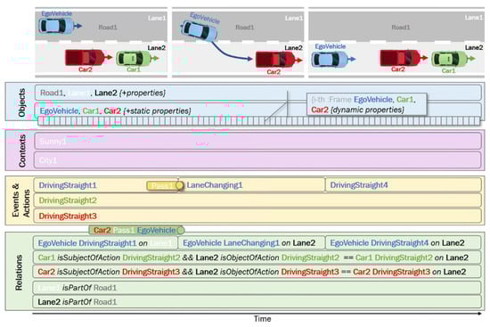 Diagram of the KITTI example scenario elements and relations illustrated over time.