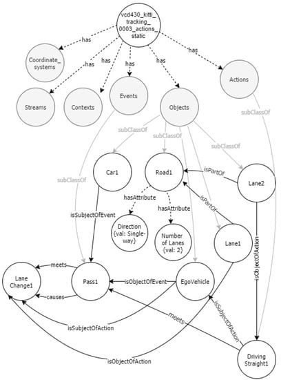 In this use case, both approaches were implemented, creating synthetic scenarios from the ALKS regulation, and real scenarios from the KITTI dataset (http://www.cvlibs.net/datasets/kitti/eval\_tracking.php accessed on 4 June 2021). These scenarios were created by first using the VCD toolkit to create the RDF entries in the OpenLABEL format, which is flexible enough to host high-level actions and relations (for the ALKS scenario), and to abstract high-level information from detailed labels (for the KITTI annotations).