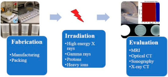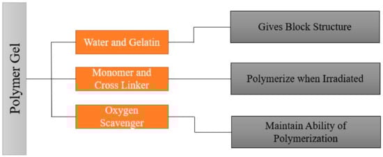 It is important to understand the fundamental chemistry and physics of response before understanding the fabrication process. To understand the fundamental chemistry and physics of response, the composition and benefits of using each element of the composition should be known. A typical polymer gel should have a composition that gives a shape, ingredients that polymerize when subjected to radiation, and ingredients that retain the gel’s polymerization ability. A typical polymer gel consists of five different compositions to use as a dosimeter and give three-dimensional dose distribution when irradiated, as shown in Figure 2. The first two components are water and gelatin, which form the block structure of the dosimeter. Two active ingredients are monomers and crosslinker, which polymerize when exposed to ionizing radiation, i.e., with more ionizing radiation, more polymerizations occur. The last ingredient is oxygen scavenger. Too much free oxygen in a dosimeter makes it inert; thus, an oxygen scavenger is used to remove chemically active dissolved oxygen, which suppresses the radical initiated polymerization.