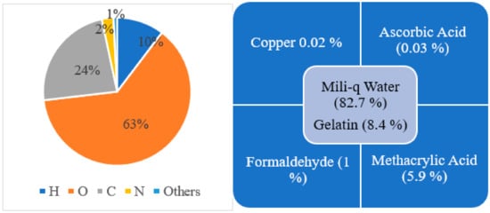 Since 1954, different changes in composition have been made to make the polymer gel more accurate in three-dimensional dose distribution and easy to manufacture, handle, and use. Early polymer gel proposed by Gore et al., consisting of ferrous sulfate, and later used by Appleby et al., consisting of ferrous sulfate dispersed in a gel matrix, could not give a spatially stable distribution of dose because of diffusion of ion [,]. After these, several studies used not only ferrous solutions with various gelling agents, such as gelatin, agarose, Sephadex, and polyvinyl alcohol (PVA), but also chelating agents, such as xylenol orange (XO), to reduce ion diffusion []. However, there was an issue in manufacture because the polymerization can be disturbed due to the oxygen presence; hence, hypoxic environment is necessary to manufacture it. To address this issue, Fong et al. developed a novel polymer gel, acronym as MAGIC gel, which is formed by mixing methacrylate-based materials, ascorbic acid, and salt copper []. Ascorbato–copper complex provides oxygen absorption, allowing for the manufacturing of polymer gels under standard atmospheric conditions in 2001 []. Another issue was the melting of samples when kept at room temperature, creating a problem for its use and handle. Fernandes et al. gave the solution to this issue in 2008 by incorporating formaldehyde to the earlier MAGIC formulation, raising the melting point of gel to 69 °C, and labeling the new gel as MAGIC-f gel []. The formaldehyde improved the stability of the matrix as a result of the high number of hydrogen bonds formed between the formaldehyde and gelatin. Note that the MAGIC-f gel fusion point doubles if 1% of formaldehyde is used [,]. After 2008, the MAGIC-f gel with the atomic and chemical composition shown in Figure 3 was proposed and used by most of the studies, including that by T. Marques et al. []. In the atomic composition (w/w), H (10.33%), O (62.68%), C (23.52%), N (2.52%), and others (0.81%) are used. Chemical composition: w/w of 82.7% of Milli-q water (water that has been purified using resin filters and deionized to a high degree by a water purification system), 8.4% of gelatin, 0.02% of copper, 0.03% of ascorbic acid, 5.9% of methacrylic acid, and 1% of formaldehyde. Although the composition proposed by Fernandes et al. has been adopted in several studies, a few studies done by Pavoni et al. increased the composition of formaldehyde in the gel. They used a greater weight of formaldehyde in the gel mixture, i.e., 3.3% by weight in mixture, where most of the studies just used 1% by weight in gel mixture [,].