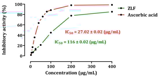 The antioxidant effect of ZLF aqueous extract was evaluated on a concentration series, and the results of the DPPH trapping activity are presented in Figure 2. The aqueous extract of ZLF exhibited inhibitory activity against the free radical DPPH in a dose-dependent manner. The half-maximum inhibitory concentration of the aqueous ZLF extract was IC50 = 116 ± 0.02 µg/mL, and was higher than that of ascorbic acid who has an IC50 = 27.02 ± 0.02 µg/mL. These results showed that the aqueous ZLF extract has considerable antioxidant activity against DPPH free radicals. This antioxidant activity of our extract is in agreement with this found by Marmouzi et al. (2019) in the aqueous extract of ZLF from the region of Sidi Sliman (Morocco) []. Moreover, ZLF from different regions of Algeria was showed a higher potential for free radical trapping DPPH []. In our work, we have shown that the aqueous extract of this plant is rich in polyphenol and flavonoids. However, phenolic and flavonoids compounds are known to have a high antioxidant effect against various reactive oxygen and nitrogen species []. Therefore, the antioxidant activity of our extract could be due to its high content of polyphenols and flavonoids.