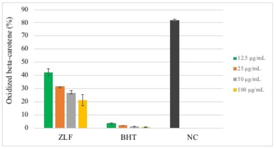 The antioxidant activity of ZLF extract was evaluated following the beta-carotene bleaching protocol described by Sun and Ho []. Indeed, a solution contains 2 mg of β-carotene, and 10 mL of chloroform were mixed with 20 mg of linoleic acid and 200 mg of Tween-80. After removing the chloroform mixture by rotavapor at 40 °C, 100 mL of distilled water was added to the flask under vigorous agitation. Then, 0.2 mL of this mixture was added to the individual test tubes containing the sample solution, and then the tubes were incubated at 50 °C in a water bath under continuous agitation for 2 h. Absorbance was measured at 0 and 2 h of incubation at a wavelength of 470 nm. BHT was used as a standard and distilled water was used as negative control (NC). The measurements were repeated three times to minimize the error. The percentage of oxidized β-carbon was calculated using the following formula:
