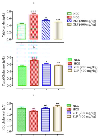 Effect of the aqueous ZLF extract on serum Triglycerides (a), Total cholesterol (b), and HDL-cholesterol (c) in mice exposed to HFD. Data are mean ± SEM, n = 6. ### p ≤ 0.001 versus NCG. * p < 0.05, ** p < 0.01, *** p < 0.001 versus HFD group. ns: not significant.