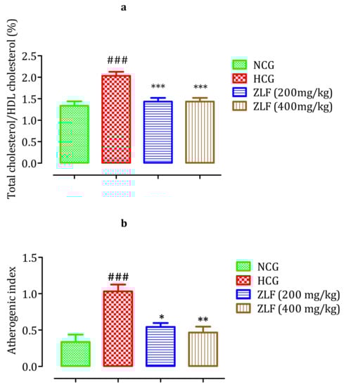 The ratio of atherogenic index and total cholesterol/HDL-cholesterol was calculated in all mice in the experiment (Figure 5). Taking a chronic high-fat diet in mice induced a significant increase in the atherogenic index (p < 0.001) and in the total cholesterol/HDL-cholesterol ratio (p < 0.001) compared to NCG. However, daily administration of the aqueous ZLF extract at 200 and 400 mg/kg doses significantly suppressed the high values caused by the high-fat diet, which has almost returned to the base range. The reduction was significant for 200 and 400 mg/kg (p < 0.05 and p < 0.01, respectively) for the atherogenic index, and the reduction in total cholesterol/HDL-cholesterol ratio was significant (p < 0.001) at doses 200 and 400 mg/kg body weight compared to HCG mice. Indeed, a lower total cholesterol/HDL–cholesterol ratio helped prevent atherosclerosis as it was directly related to cardiovascular disease []. The ZLF extract significantly decreased the total cholesterol/HDL–cholesterol ratio in fat-overloaded mice, confirming that this extract has a beneficial effect on lipid profile regulation and ultimately prevents cardiovascular disease. This is consistent with other work examining the anti-hyperlipidemia effects of plant extracts [,,,].