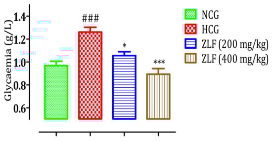 Effect of the aqueous ZLF extract on blood glucose level in mice exposed to HFD. Data are mean ± SEM, n = 6. ### p ≤ 0.001 versus NCG. * p < 0.05, *** p < 0.001 versus HFD group.
