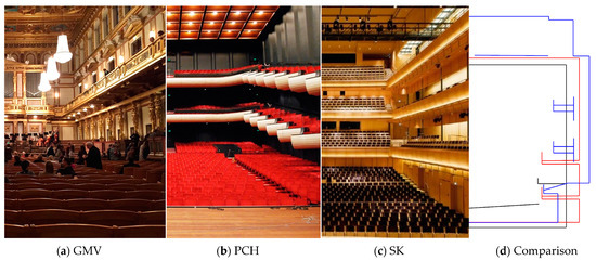 (a) Große Musikvereinssaal (photo: J.O. García); (b) Perth Concert Hall (photo: Marshall Day Acoustics); (c) Stavanger Konserthuset (photo: https://sso.no/en/seating-plan-fartein-valen/ accessed on 24 August 2021); (d) Comparison of concert hall’s cross-section: (Black) Große Musikvereinssaal, (Red) Perth Concert Hall, (Blue) Stavanger Konserthuset [25].