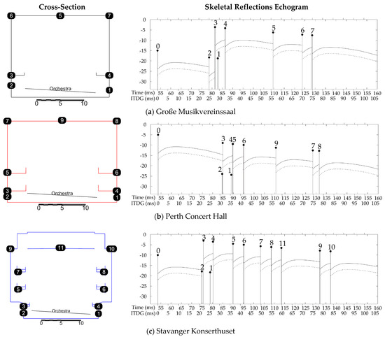 Skeletal Reflections Analysis for three concert halls: (a) Große Musikvereinssaal, (b) Perth Concert Hall, (c) Stavanger Konserthuset. Time indicates the absolute time of arrival, and Initial Time Delay Gap (ITDG) is the arrival time after the direct sound. The dashed line indicates the absolute threshold of perceptibility after Schubert. The solid line is the probable threshold for useful contribution.