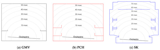 From Figure 4, the influence of the parterre width can be seen —the narrower parterre (SK) provides the first lateral reflections around 20–25 ms—whereas in the wider ones, the first lateral reflections only reach the receiver around 30–35 ms.