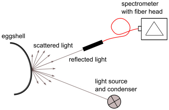 Spectral data were collected in a laboratory setup; a schematic of the setup is shown in Figure 1. The measured sample was placed on an XY translation stage, enabling proper sample positioning. The light source used was an incandescent lamp. The light beam was formed by a condenser lens for proper illumination of the object. The spectrometer fiber head (Thorlabs CCS100/M with M14L01 fiber head attached) was mounted on a movable arm that could be angularly adjusted to maximize the reflected signal on the detector. Such placement of the head enabled the easy and fast adjustment of the setup to different curvatures of egg samples.