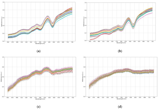 The visualization of an exemplary ten samples taken from each categorical subset: brown eggshell from (a) MS-infected and (b) healthy hens; white eggshell from (c) MS-infected and (d) healthy hens. Different colors determine different samples.
