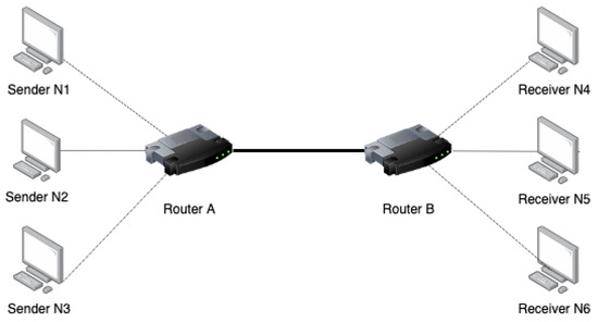 The standard dumbbell topology with two routers and six nodes (N1–N6) was used (see Figure 1). The simulations were carried out using two basic scenarios presented in [17], i.e., Data Center and Access Link.