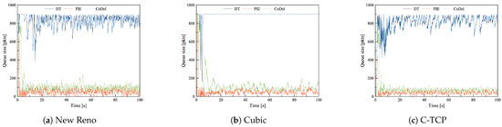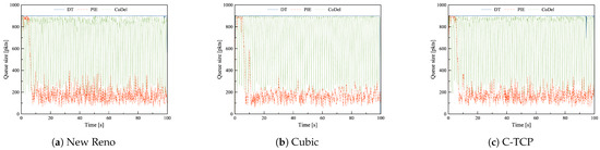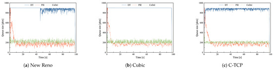 The queue length of DT, PIE and CoDel in combination with (a) New Reno, (b) Cubic, and (c) C-TCP in the Access Link scenario with common TCPs during heavy congestion.