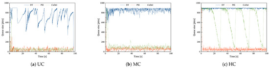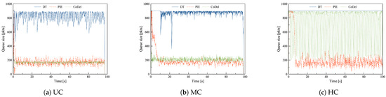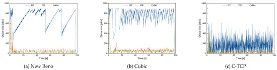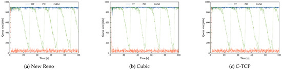The observed queue behavior is similar to previous scenarios. DT allows filling the queue, which results in a large average queue size and, consequently, long delays. In the uncongested network, the queue oscillations, therefore delay variations, are the highest (see Figure 9a). In the uncongested and mildly congested network, PIE and CoDel provide similar results, i.e., rather short and stable queues. CoDel, as depicted in Figure 9c, fluctuates between the maximum and the target value of queue size in the heavily congested network, which results in unacceptably high queue size variations. PIE acts similarly in all load scenarios and provides comparable average queue size and rather small variations. However, during heavy congestion, it causes considerably more packet losses than the other two approaches.