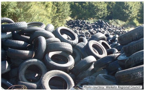 - Dangerfield, E. Community Asked to Call for Government to Combat Tyre Stockpiling Through Legislation. The Press. Available online: https://www.stuff.co.nz/the-press/news/north-canterbury/101908978/community-to-call-for-central-government-to-combat-tyre-stockpiling-through-legislation (accessed on 8 July 2021).