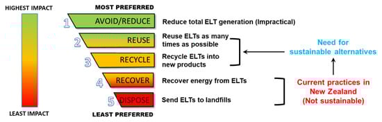 Waste management hierarchy applied to ELTs in the New Zealand context (adopted from []).