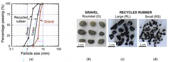 Material tested in this study: (a) Particle size distribution; and physical aspect of (b) gravel, (c) large rubber particles, and (d) small rubber particles (adopted from []).