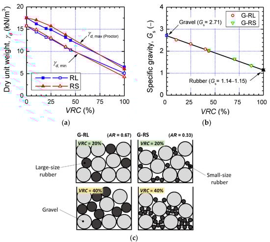 As the rubber particles are much lighter than the gravel ones (Figure 4b), both the minimum and maximum dry unit weights of GRMs decrease almost linearly by increasing VRC. It is worth mentioning that, at VRC ≤ 40%, the dry unit weight values of G-RS were slightly above the linear trends. This is because at lower VRC values, small rubber particles can easily occupy the large voids between gravel grains (Figure 4c), which results in an increase in the density state of the mixtures [,,]. In contrast, because the size of RL particles is almost similar to that of the gravel, the rubber particles cannot fit in the voids between the gravel grains, even at lower VRC, but rather replace the gravel grains in the mixtures. For completeness, a schematic illustration showing idealized packing density arrangements between gravel and RL and RS particles is reported in Figure 4c for VRC = 20% and 40%.