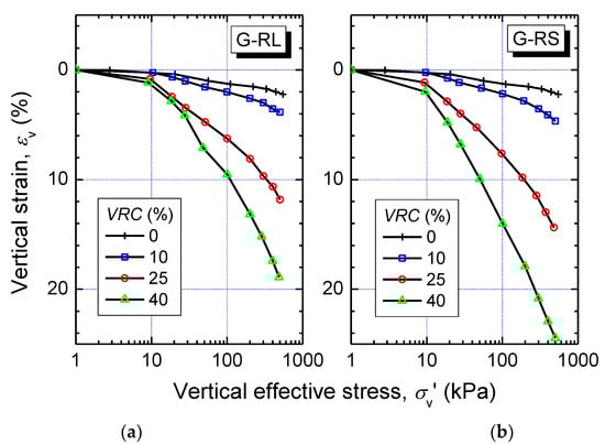 Compressibility of GRMs in 1-D compression tests with 2-h creep: (a) G-RL and (b) G-RS mixtures.