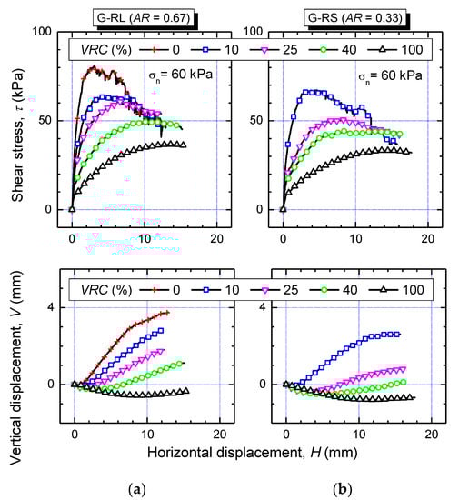 The stress–strain–volumetric behavior of G-RL and G-RS attained by direct shear tests at 60 kPa normal stress (σn) is compared in Figure 6. It can be seen that, as VRC increased, the GRM response progressively changed from dilative with a clear peak shear state (gravel-like behavior) to contractive without a peak shear state (rubber-like behavior). Similar tendencies were observed at σn = 30 and 100 kPa.