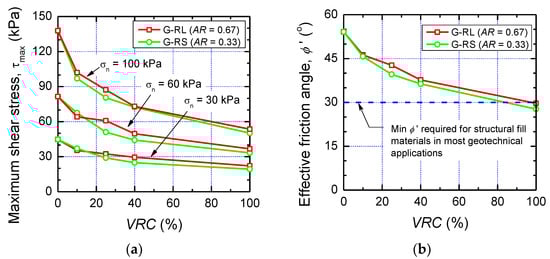 The summary plot reported in Figure 7a shows the change in maximum shear stress (τmax that was evaluated at peak state for dilative materials or at large deformation for contractive materials) with increasing VRC for all mixtures sheared at σn = 30, 60, and 100 kPa. It can be seen that the trends were very similar for both G-RL and G-RS, indicating that the effect of AR on the strength of tested GRMs was almost insignificant. Alternatively, for any given σn value, τmax decreased considerably with increasing VRC. Moreover, such decay was more significant at higher σn. For example, at σn = 100 kPa, τmax was approximately 137 kPa at VRC = 0% (gravel) and 73 kPa at VRC = 40%, corresponding to a reduction of 1.9 times. At σn = 30 kPa, τmax is approximately 45 kPa at VRC = 0% and 28 kPa at VRC = 40%, corresponding to a reduction of 1.6 times.