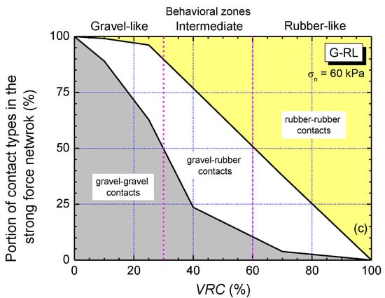 The packing properties of GRMs described earlier (Section 4.1) may provide valuable information on their mechanical behavior (refer to Figure 5, Figure 6 and Figure 7). Nonetheless, the load-transfer mechanism within the mixtures depends predominantly on the skeleton material [,,], which is formed when particles of the same material are in contact with each other and are able to transfer loads. The material forming the skeleton becomes the matrix material that governs the general mechanical behavior of a mix. As shown by Figure 8, DEM-based micro-mechanical strong-force network analyses conducted by Chiaro et al. [] have indicated that two matrix materials can be expected for GRMs: (i) a gravel matrix, leading to a stiffer gravel-like response of GRMs (VRC ≤ 30%); and (ii) a rubber matrix, producing a softer rubber-like behavior of GRMs (VRC ≥ 60%). In between, an intermediate gravel–rubber behavior will likely take place (30% < VRC < 60%). Such distinct behavioral zones provide a framework explaining the gradual change in behavior from stiff gravel-like to soft rubber-like, as observed in the direct shear tests.