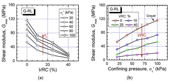 Variation of small-strain shear modulus (Gmax) of G-RL with: (a) VRC, and (b) confining pressure (adopted from []).