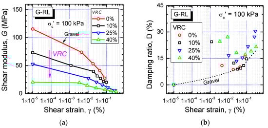 On the other hand, the results of small-strain drained cyclic triaxial tests revealed that the addition of rubber aggregates into GRMs delays the G degradation on one side and increases D on the other (Figure 10). This is an important outcome demonstrating that GRMs will perform better than gravel only under cyclic loading, maintaining their initial stiffness and dynamic properties over a larger range of shear strains. Clearly, this is due to the ability of soft rubber particles to rebound and dissipate energy.