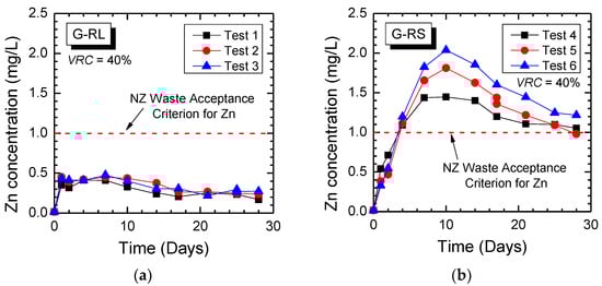 Concentration of zinc from 28-day batch leaching tests on GRMs (VRC = 40%) placed in deionized water: (a) G-RL; and (b) G-RS mixtures.