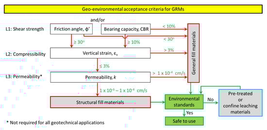 Because of the critical aspects identified in this study such as long-term creep compressibility and leaching of heavy metals, design criteria simply based on strength and permeability may not be sufficient to fully judge whether or not a GRM meets all the geotechnical requirements for structural fills. To overcome this issue, a modified framework with additional geotechnical design criteria including three levels of acceptance is proposed for GRMs (Figure 12):