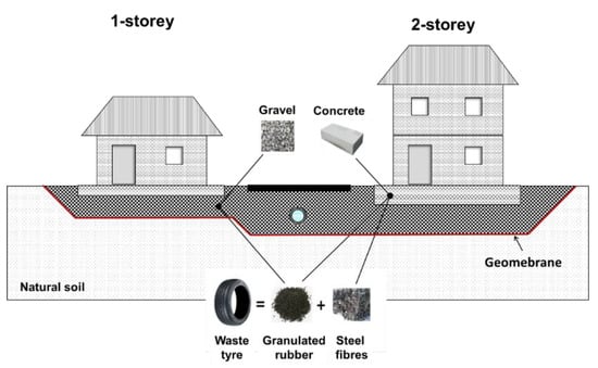 Schematic illustration of the “Eco-rubber geotechnical seismic-isolation” (ERGSI) foundation systems (adopted from []).