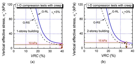 On the other hand, to guarantee the serviceability during and after the superstructure construction (i.e., to avoid damage to pipelines and other essential services that may be embedded in gravel-rubber foundation layer), and meet the compressibility criteria (εv ≤ 3%), it appears that only the G-RL mixtures with VRC ≤ 40–45% would be suitable for 1-storey buildings and those with VRC ≤ 35% would be suitable for 2-storey buildings (Figure 14).