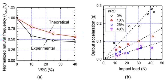 Dynamic properties of G-RL mixtures from impact load tests: (a) decay of natural frequency with increasing VRC; and (b) reduction in output acceleration with increasing VRC.