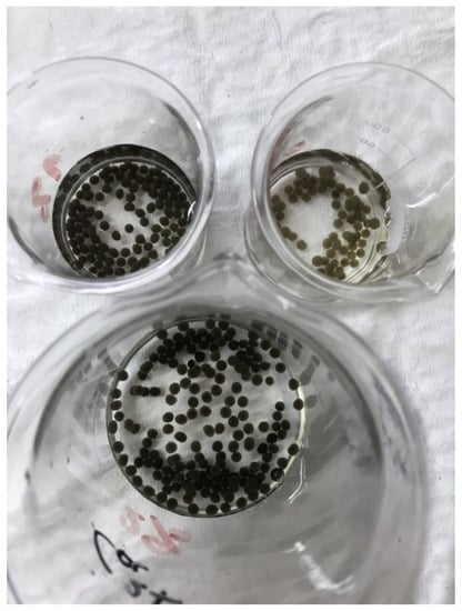 For the insertion of the GO-Chm powder nanocomposite in sodium alginate (SA) beads, the procedure of Lazaridis et al. [] was followed. Quantity of 1 g of sodium alginate was added in 100 mL deionized water, preparing a solution of 1% w/v and heating it at 60 °C until all of the solid was dissolved and a gel was formed. Then, appropriate amounts of GO-Chm were added to the gel, according to the % w/w that was desirable. In this work, 0.5%, 1% and 2% w/w of beads were prepared by adding 0.5, 1 and 2 g of the nanocomposite. Then, with the use of a Pasteur pipette, with a diameter of 1.46 mm, the gel was sucked and dropped in the form of droplets in an aquatic medium of 250 mL 0.3 M CaCl2∙2H2O, at an ideal distance of 6 cm between the surface of the medium and the pipette tip. The formed beads (Figure 1) were stirred in the calcium bath for 24 h and before each application, they were washed three times with deionized water to remove any excess of calcium ions and were left to dry in a filter paper.