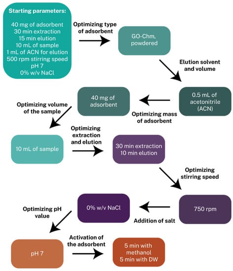 A set of parameters were studied for the optimization of the SB-MSPE protocol in the order that is described in Figure 4. For example, when the mass of the adsorbent was examined, the type of adsorbent was powdered GO-Chm, with ACN as an elution solvent and 0.5 mL as the eluent volume, with the duration of the extraction and elution being 30 min and 15 min, respectively, while the stirring speed was kept at 500 rpm and the sample volume being 10 mL, with a pH value of 7 and 0% w/v addition of NaCl.
