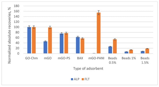 Bar diagram of the normalized absolute recoveries of the different adsorbents according to GO-Chm.