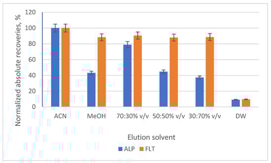 Bar diagram of the normalized absolute recoveries of the different types of elution solvent according to acetonitrile (ACN).