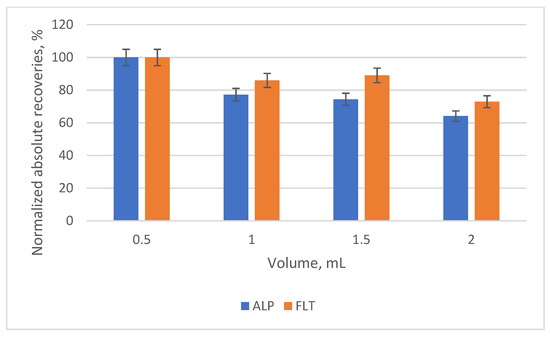 The second parameter was the type and the volume of the elution solvent that would be used. ACN and MeOH were used in different volume ratios (100:0, 0:100, 70:30, 50:50, 30:70% v/v), while the possibility of adding a step of washing after the extraction and before the elution was studied with the addition of 1 mL of deionized water. The best results were shown with the pure ACN as a solvent, as it is a stronger eluent than MeOH, while the usage of deionized water showed a drop in the normalized absolute recoveries by 9–9.5% for the two analytes. Additionally, the elution volume that was selected was 0.5 mL, due to the increase in the preconcentration factor (or enrichment factor, EF) it provided. The prospect of using a nitrogen stream to evaporate the eluent and reconstitute it in a lower volume was also investigated, but the matrix effect would not allow their detection. Lastly, the EFs of the two compounds were calculated using the equation: EF = (Vsample/Veluent) × (Rabs%/100), where Rabs is the absolute recovery of each compound. In Figure 6 and Figure 7, the bar diagrams of normalized absolute recoveries are demonstrated for the type and the volume of eluent, respectively.
