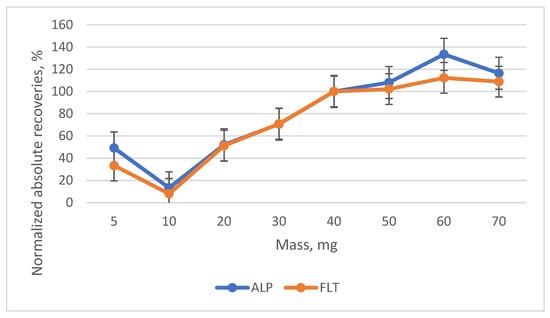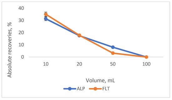 Four volumes of the sample were assessed to obtain the greatest results. The former two volumes (10 and 20 mL) of the sample were added in a glass vial with the capacity of approximately 30 mL, while the latter two (50 and 100 mL) were put in glass beakers of 100 and 250 mL, respectively. The concentration of the analytes was the same in all four volumes, viz 10 ng/μL. In Figure 9, the diagram of the absolute recoveries is shown.