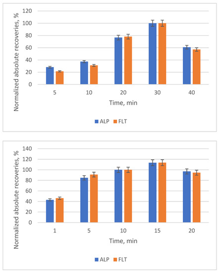 Bar diagram of the normalized absolute recoveries of the different durations of extraction (above) and of the elution (below) according to 30 min and 10 min, respectively.