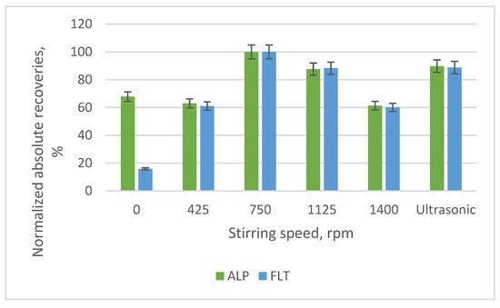 Bar diagram of the normalized absolute recoveries of the different speeds of stirring and the application of ultrasonication according to 750 rpm.