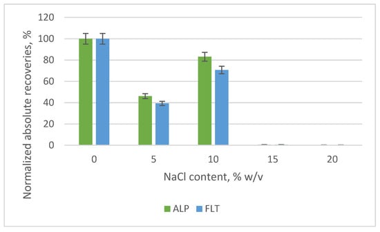 Bar diagram of the normalized absolute recoveries of the different percent content (% w/v) of salt according to the optimal 0%.