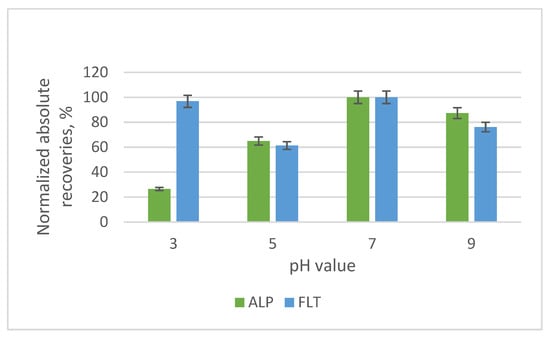 The pH value affects the degree of ionization of the two benzodiazepines, so four values were studied. For this purpose, 10 mL of 1% v/v acetic acid, 10 mL of buffer solution of 0.5 M acetic acid—0.5 M sodium acetate, the addition of 10 mL deionized water and 10 mL of 1% w/v sodium acetate were prepared to reach the desired pH values of 3, 5, 7 and 9, respectively. The highest recoveries were acquired at a pH value of 7, where both ALP and FLT were 100% unionized and no extra reagents were used to change the pH value (Figure 13).