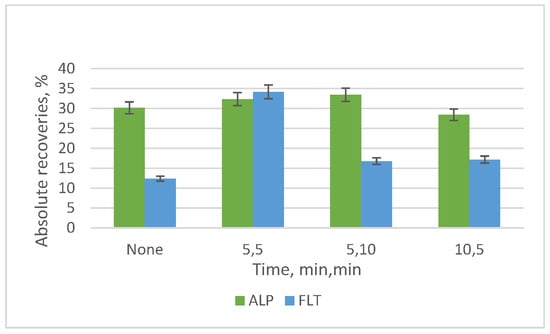 Diagram of the absolute recoveries that depend on the activation of the adsorbent. The first duration refers to the first step of immersion in methanol and the second duration to the second step of the addition of deionized water.